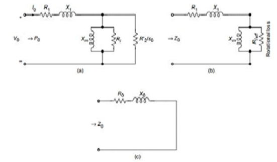 Figure 2: Equivalent circuit models at No Load — (a) Full model with R2/s in parallel with Ri; (b) Simplified model combining parallel shunt resistances; (c) Final reduced no-load equivalent circuit with R0 and X0.