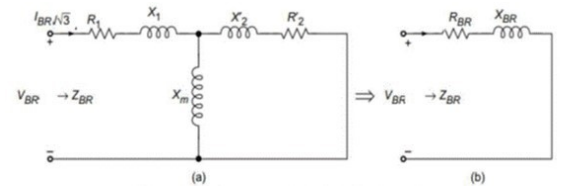 Figure 3: Equivalent circuit model for Blocked Rotor Test — (a) Full circuit with Xm in shunt; (b) Simplified series RBR-XBR circuit (Xm ignored as it is much larger than series impedance).