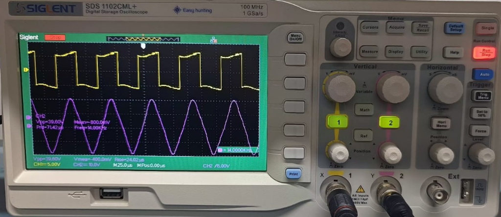 - Set the input frequency to approximately 5 kHz and observe the charging/discharging waveform.