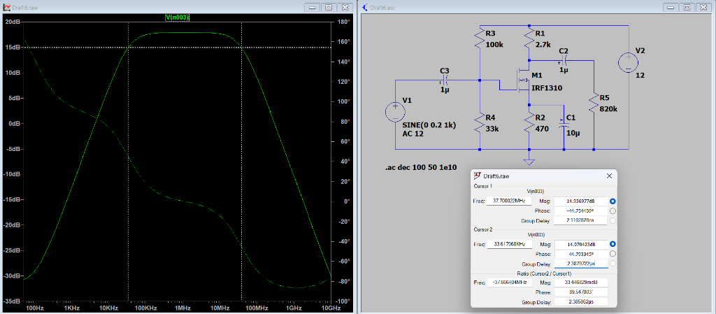 - The upper cutoff frequency differs significantly: ~750 kHz (hardware) vs ~37.7 MHz (simulation). This is primarily due to the use of IRF1310 (a high-current power MOSFET with different parasitic capacitances) as a substitute for 2N7000 in LTspice, which does not accurately model the high-frequency behaviour of the 2N7000 signal MOSFET.