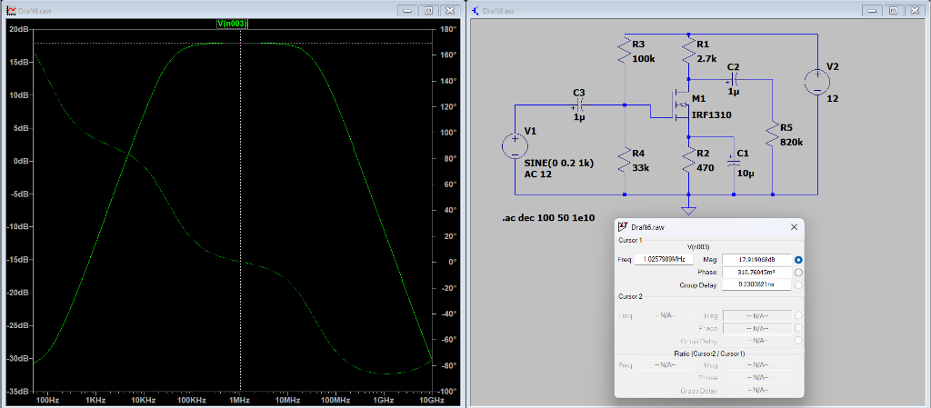 LTspice simulation — Peak gain identification: Cursor at 1.026 MHz shows peak gain of 17.92 dB. LTspice schematic uses IRF1310 (equivalent for 2N7000), with .ac dec 100 50 1e10 directive.