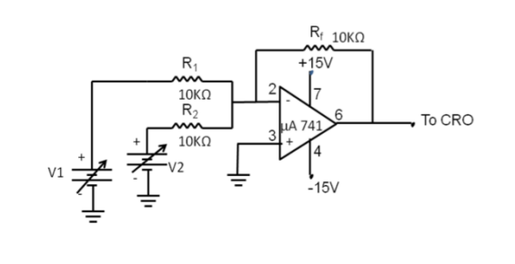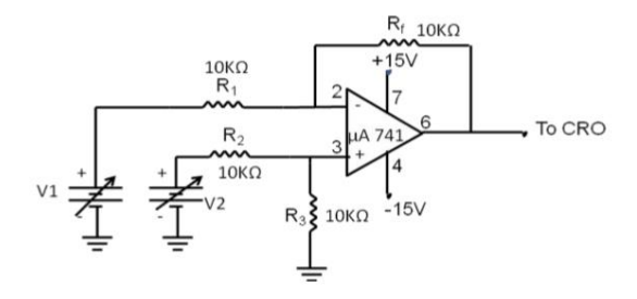 - Connect the summing amplifier circuit (Fig 1) with R1 = R2 = Rf = 10 kΩ. Apply two DC input voltages V1 and V2 and measure Vout = −(V1 + V2) for the combinations given in the observation table.