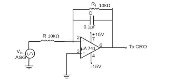 - Connect the integrator circuit (Fig 3) with R = 10 kΩ and C = 0.1 µF. Apply a sine wave (10 kHz, 2 Vpp) and observe the 90° phase-shifted cosine output.