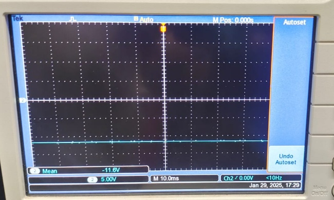 Oscilloscope — Antilog amp saturation: Mean = −11.6 V (Ch2), confirming output is clamped at the negative supply rail. Supply = ±12 V; Op-Amp output saturates at ≈ −(Vcc − 0.4) = −11.6 V. Matches simulation.