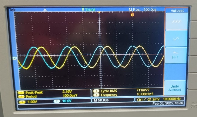 | Integrator (sine 10 kHz) | 90° phase-shifted cosine | Cosine output confirmed | Probe reversal caused sign flip |