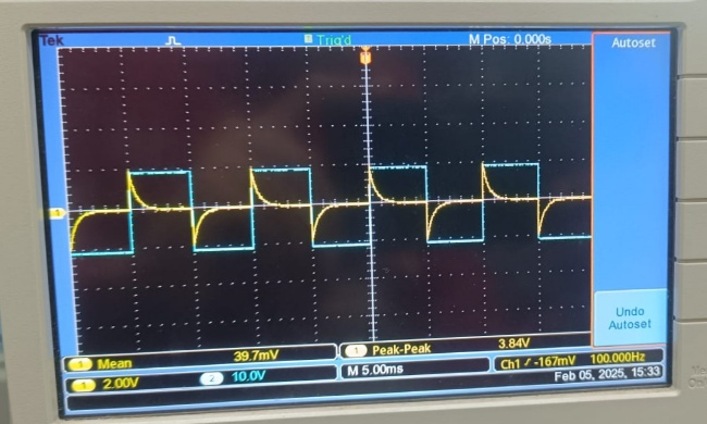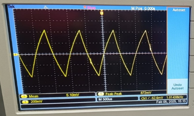 | Integrator (square wave) | Triangular output | Triangular waveform, Vpp=872 mV | — |