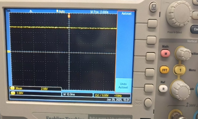 Oscilloscope — Summing amp: Mean = 2.56 V (displayed positive due to probe reversal; actual output = −2.56 V for V1=2, V2=0.5). Confirms correct summation with ~0.06 V error from ideal −2.5 V.