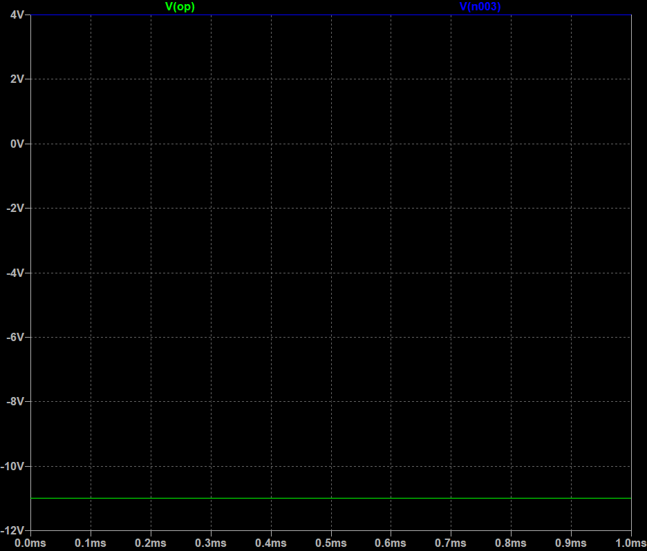 LTspice simulation — Log amp: Vin = 4 V → Vout = −457.47 mV. Flat DC line confirms steady-state log operation. Matches hardware observation of −457 mV at Vin = 4 V.