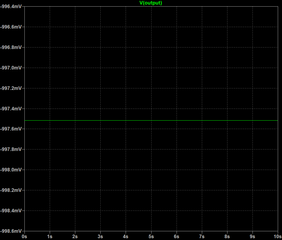 LTspice simulation — Differential amp: V1 = 2 V, V2 = 1 V → Vout = −997.5 mV ≈ −1 V (theoretical: V2 − V1 = −1 V). Confirms subtractor operation.
