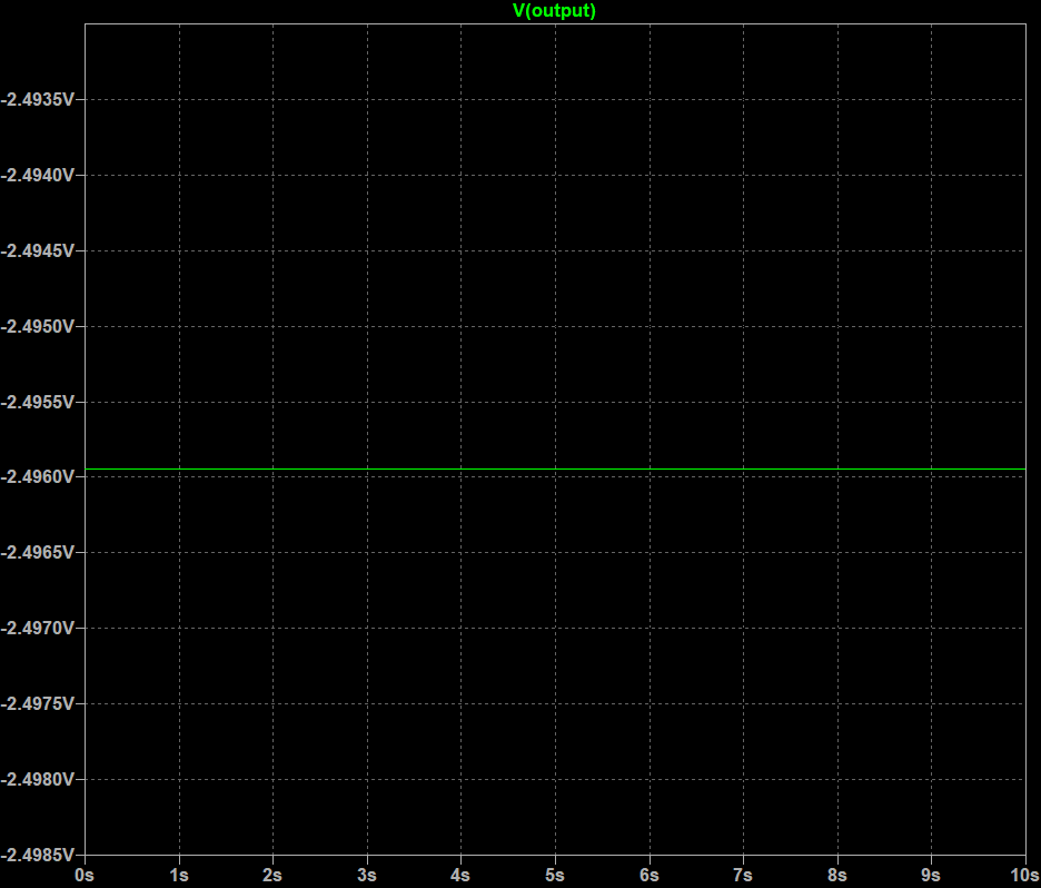 LTspice simulation — Summing amp: V1 = 2 V, V2 = 0.5 V → Vout = −2.4975 V (theoretical: −2.5 V). Flat DC output confirms correct inverting summation.