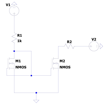 - Connect M1 in diode configuration (gate shorted to drain). Connect both sources to ground.