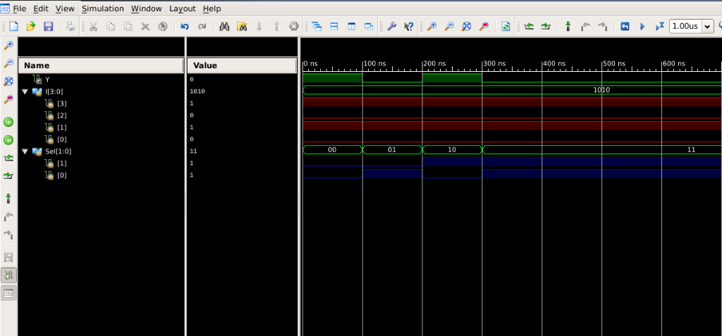 Simulation Output for 4:1 Multiplexer showing select lines and output.