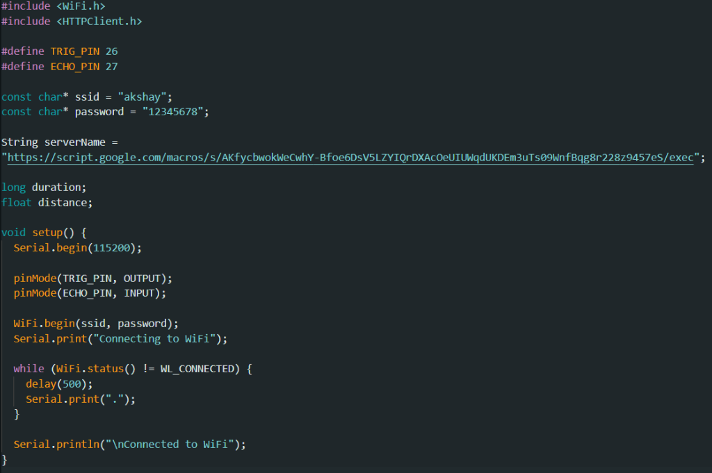 - The ESP32 successfully connected to the configured Wi-Fi network and transmitted the distance measurement data to Google Sheets.