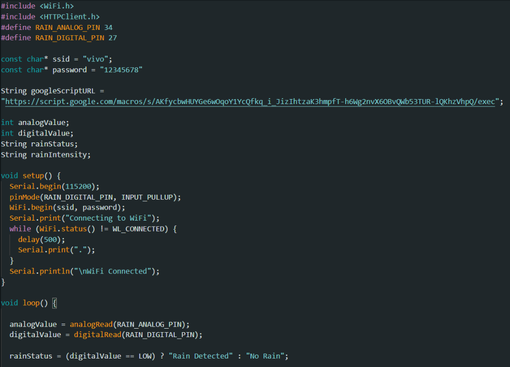 - The ESP32 successfully connected to the configured Wi-Fi network and transmitted the rain sensor data to Google Sheets.