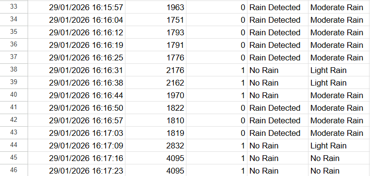 - Each set of analog and digital rain sensor readings was logged in Google Sheets along with the corresponding timestamp for further analysis.