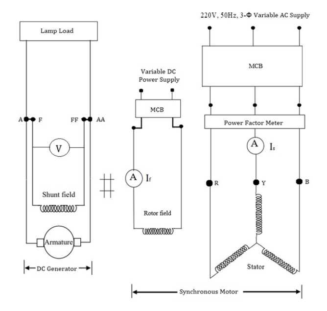- Part A — No-Load V and Inverted-V Curves: With no output from the coupled DC generator (no load on synchronous motor), vary the field current If of the synchronous machine using the variable DC supply. For each value of If, record the stator armature current Is and power factor. Cover the full range from under-excitation to over-excitation.