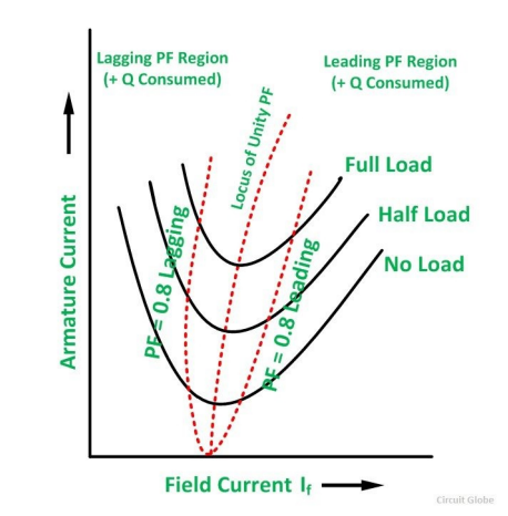 - The inverted V-curves (PF vs If) confirm that the power factor reaches a maximum value of unity at the normal excitation point for each load, with the peak shifting to a higher field current as load increases.