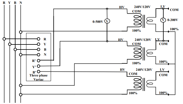 - Repeat steps 2 and 3 for five sets of voltages between 0 and 415 volts on the HV side.