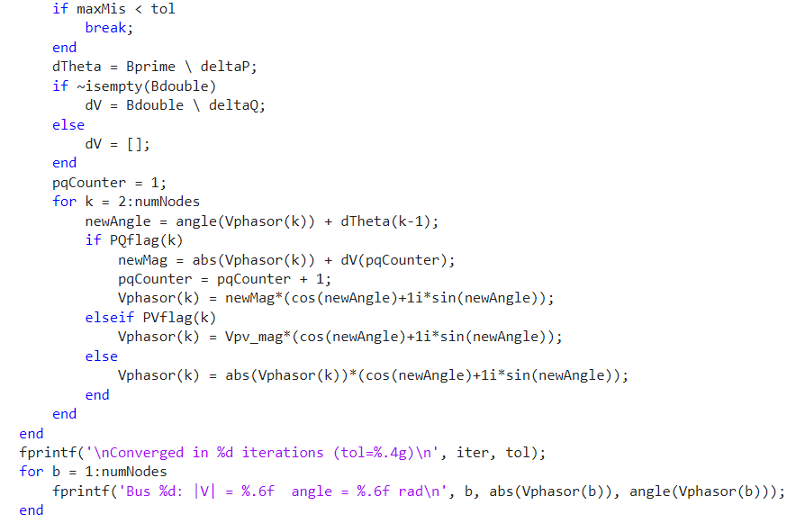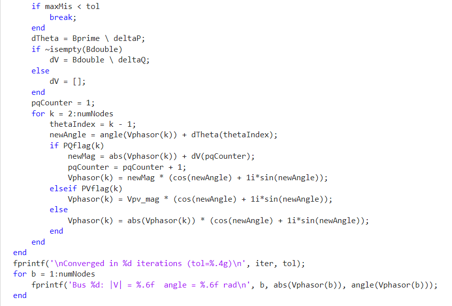 Figure 8: MATLAB Code for Fast-Decoupled Method — Q2 (Part 3)
