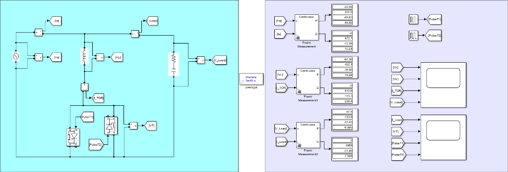 - Open MATLAB/Simulink and build the TCR model using an AC Voltage Source, Series RLC Branch (as the reactor), two anti-parallel Thyristors, and Pulse Generator blocks for firing pulses.