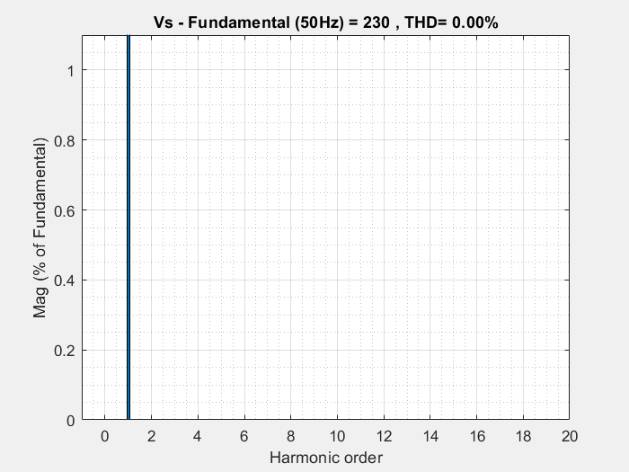The THD of the source voltage is observed to be 0.00%. This is expected because VS is the input supply waveform provided as an ideal sinusoid in the simulation, confirmed by the clean sinusoidal waveform visible in the scope output.