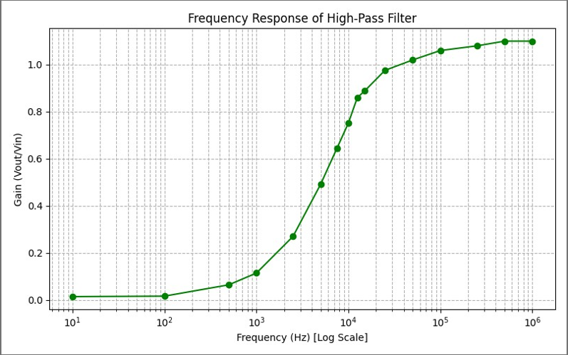 Frequency Response of the High-Pass Filter — Gain (Vout/Vin) vs Frequency (Hz) on log scale.