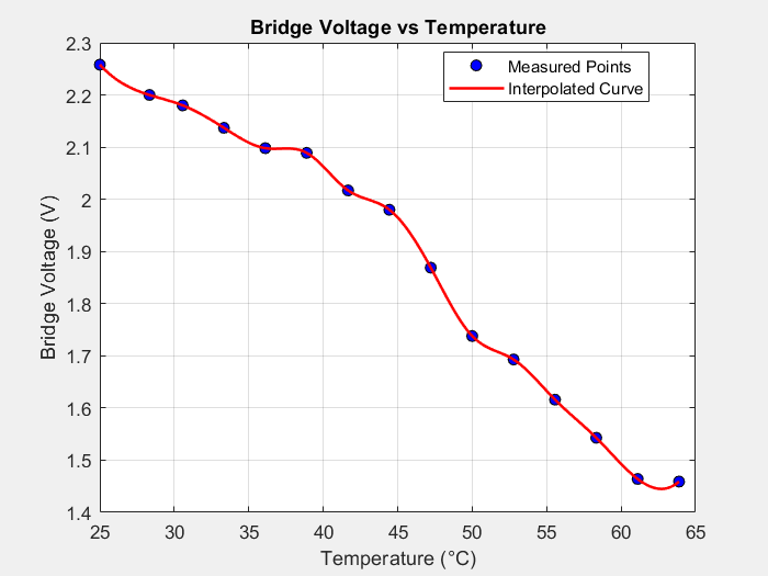 - Calculate RT and measured temperature from bridge voltage readings.