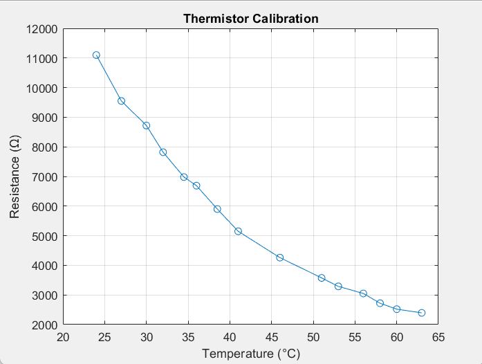 Figure 1: Thermistor Resistance vs Temperature (Calibration Curve) plotted in MATLAB.