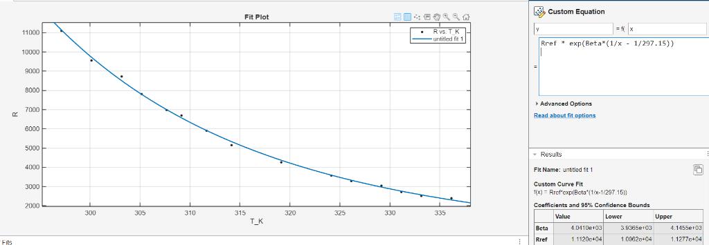 - Plot the calibration data (resistance vs temperature) in MATLAB.