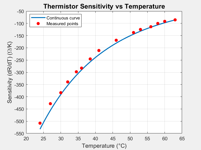 Figure 3: Temperature vs Sensitivity of the Thermistor. Continuous curve = calculated sensitivity; red dots = measured points.