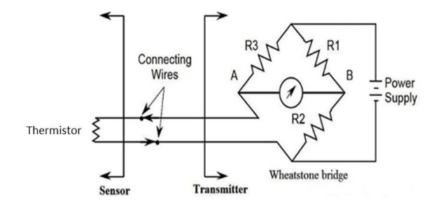 Thermistor incorporated in a Wheatstone bridge circuit for signal conditioning. Output voltage VAB is proportional to the change in thermistor resistance.