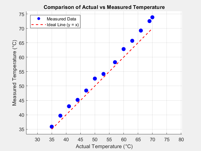 Figure 4: Actual Temperature vs Measured Temperature for Thermistor system. Measured points track above the ideal line (y = x), indicating a consistent positive offset.